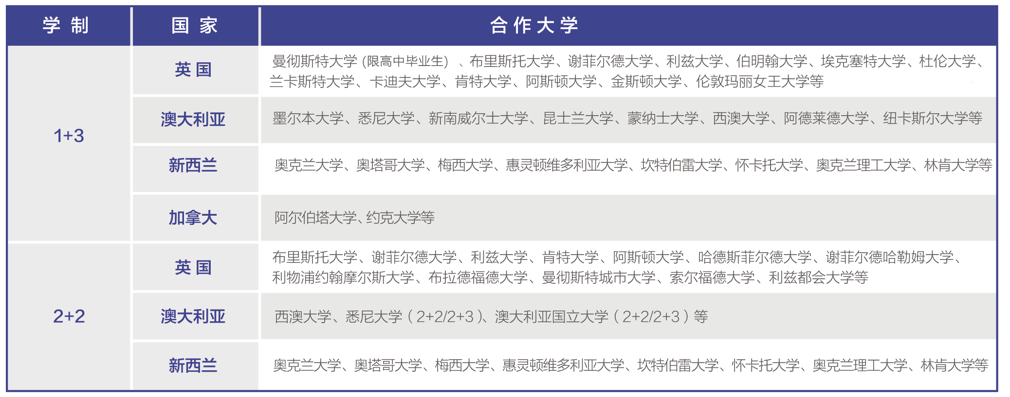 2+2:学生在我校就读两年的预科和国际大一课程(EAP英语课程的成绩可代替雅思作为语言成绩申请国外大学),顺利完成学业并通过所有课程的考试后根据成绩申请转入国外合作大学学习两年的本科课程,完成学业后可获得国外大学学士学位。