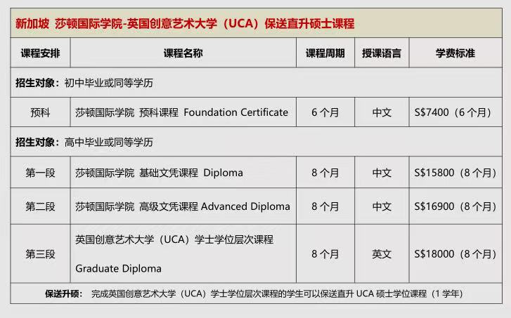 高中毕业或同等学历的学生在莎顿国际学院依次完成:专业基础文凭课程(8 个月)、专业高级文凭课程(8 个月),本科学位及相应学历层次文凭课程 (8 个月)。三个阶段共计 24 个月(全部在新加坡完成),相应学历文凭课程即可选择英国格鲁斯特大学(UOG)学士学位课程 BA(Hons),毕业后获得英国格鲁斯特大学授予的学士学位,也可选择英国创意艺术大学(UCA)学士学位层次课程Graduate Diploma,毕业后可保送直升UCA硕士学位课程(1 学年)。